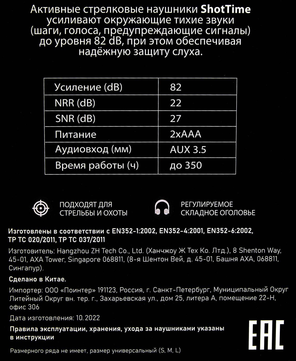 Наушники активные ShotTime 30 BT стрелковыеNRR 22dBоголовье тканьвремя работы до 350ччёрные334г