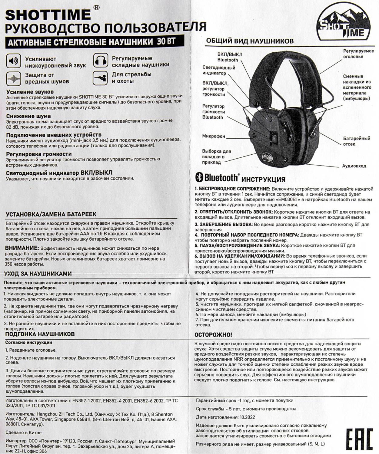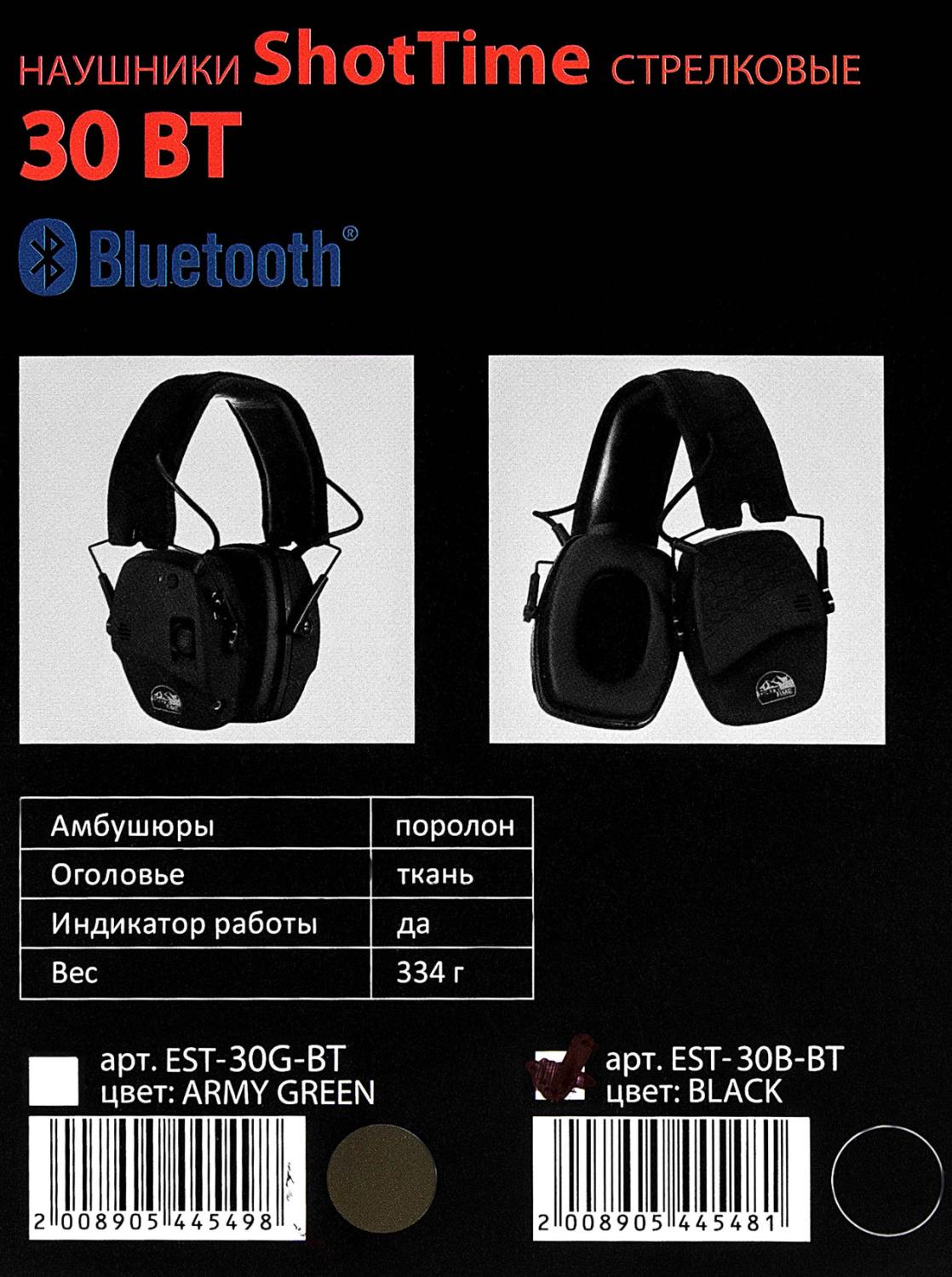 Наушники активные ShotTime 30 BT стрелковыеNRR 22dBоголовье тканьвремя работы до 350ччёрные334г