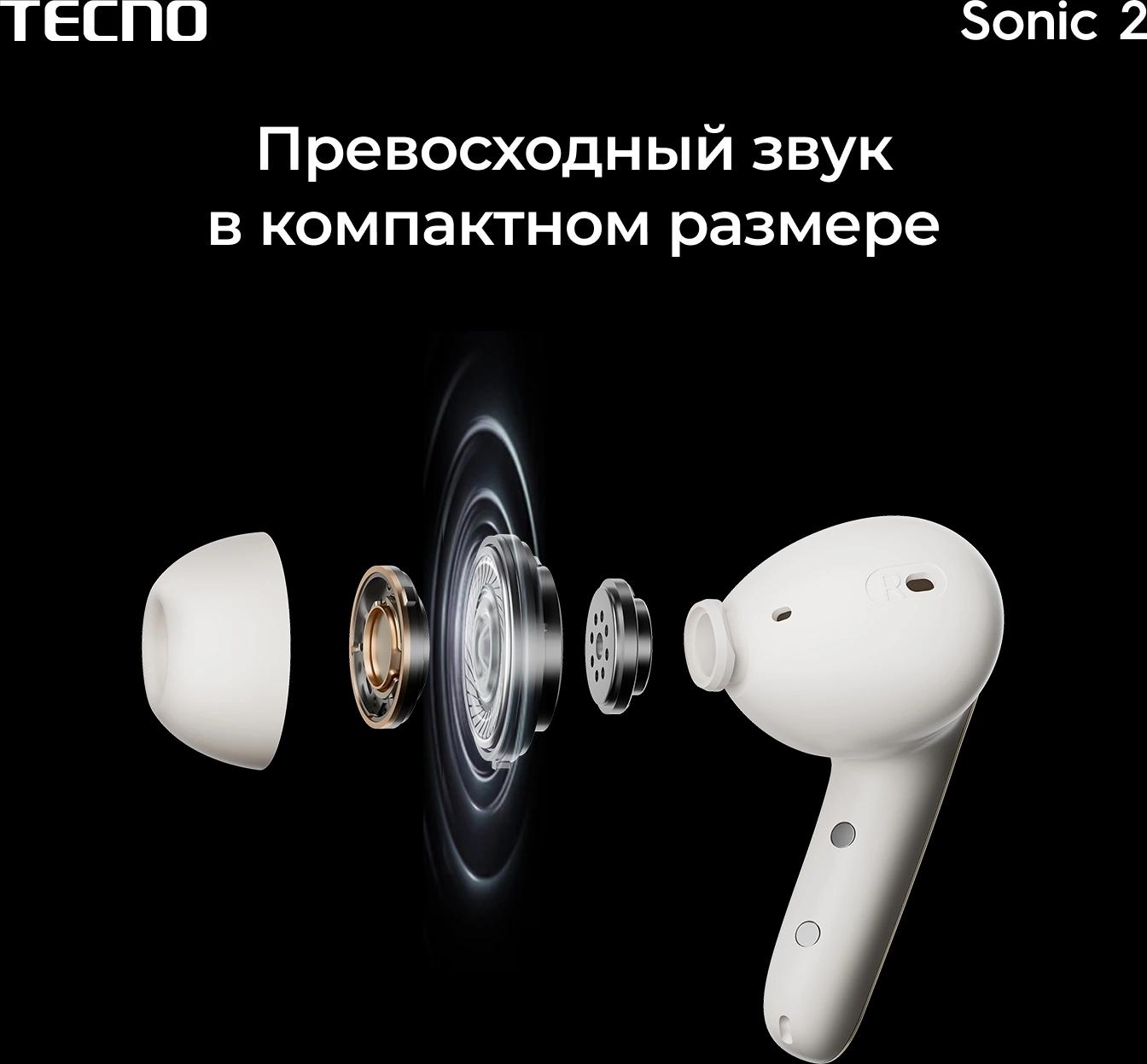 Высокое качество шумоподавления гарантирует низкий уровень посторонних звуков во время звонков и видеоконференций, где бы вы ни находились в этот момент. В каждом из наушников TECNO Sonic 2 установлено по три микрофона, которые с помощью алгоритмов искусственного интеллекта анализируют и устраняют окружающий шум, сохраняя при этом разборчивость речи для голосовых вызовов.