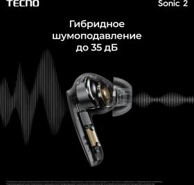 Чтобы достичь наилучшего качества звука без внешних помех, наушники TECNO Sonic 2 используют технологию активного шумоподавления. С помощью микрофонов прямой и обратной подачи сигнала, нейтрализуется окружающий шум до 35 дБ, что позволяет вам полностью погрузиться в любимую музыку, а также с комфортом общаться во время звонков.