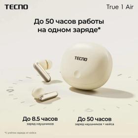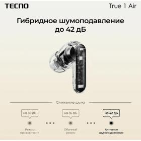 Наушники True 1 Air имеют три режима работы и обеспечивают мощный, насыщенный звук с глубокими басами, а также гибридное шумоподавление, снижающее окружающие шумы вплоть до 42 дБ в режиме активного шумоподавления.