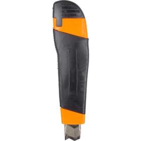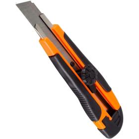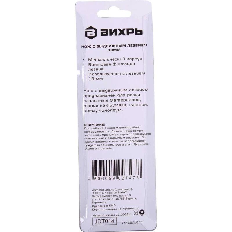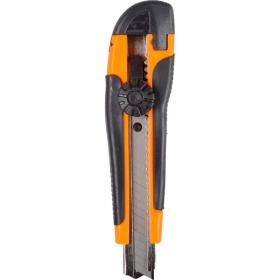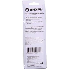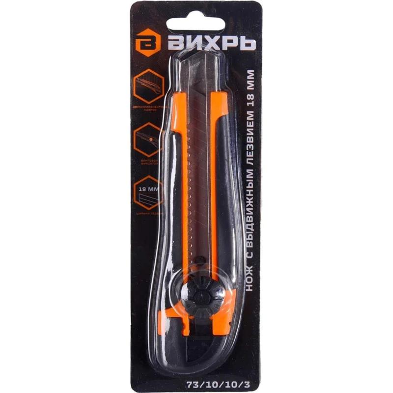 Нож строительный безопасный с фиксатором Вихрь 18 мм (73/10/10/3) предназначен для резки различных материалов в бытовых, хозяйственных или строительных целях, оснащен металлической направляющей лезвия, что повышает прочность ножа при давлении на него во время резки.Особенности изделия:- Двухкомпонентный корпус из пластика;- Сменное сегментированное лезвие из стали;- Фиксатор лезвия - винтовой (Twist-Lock).Характеристики изделия:- Длина ножа: 150 мм;- Ширина лезвия: 18 мм;- Толщина лезвия: 0.35 мм;Схема замены лезвия: 1. Открутите и снимите роликовый фиксатор. 2. Снять со шпинделя отработанное лезвие, установить новое. 3. Закрутите роликовый фиксатор.Меры предосторожности:- При работе с лезвиями используйте средства защиты.- Не утилизируйте лезвия с бытовыми отходами.- Хранить в недоступном для детей месте.Внешний вид и/или характеристики товара могут быть изменены производителем в соответствии с производственным процессом.