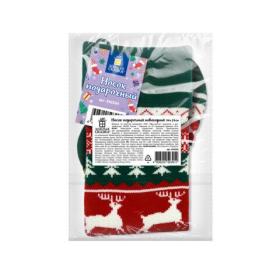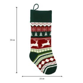 Размер - 23*2*54см, материал - полиэстер. Цвет - зеленый, красный. К носку прикреплена этикетка. Также носок упакован в пакет с клейким краем.