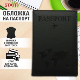 Обложка для паспорта STAFF надежно защитит документ от изнашивания и загрязнения, а также придаст изделию изысканный и неповторимый вид.Модель выполнена из экокожи черного цвета с эффектом soft-touch и украшена тиснением в виде надписи "Passport" – на обложку нанесено изображение самолета и карты мира. Имеет простроченные края и мягкую изолоновую вставку. На внутреннем развороте расположены два кармана из прозрачного пластика. Благодаря компактным размерам 98х141 мм документ в обложке удобно носить с собой.
