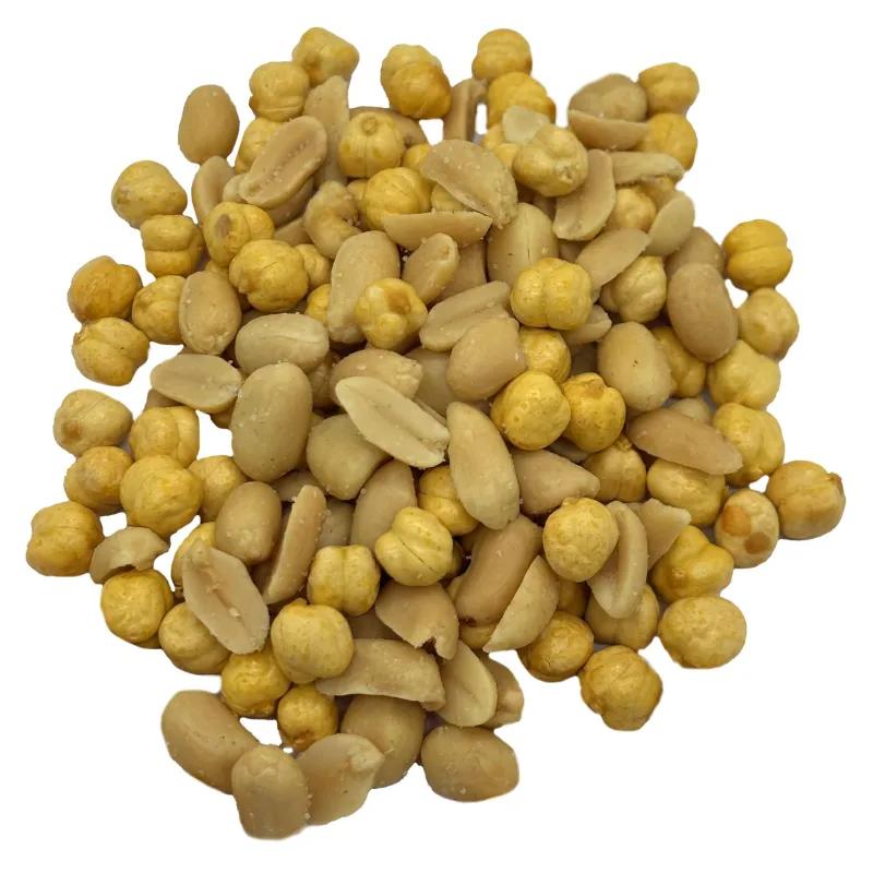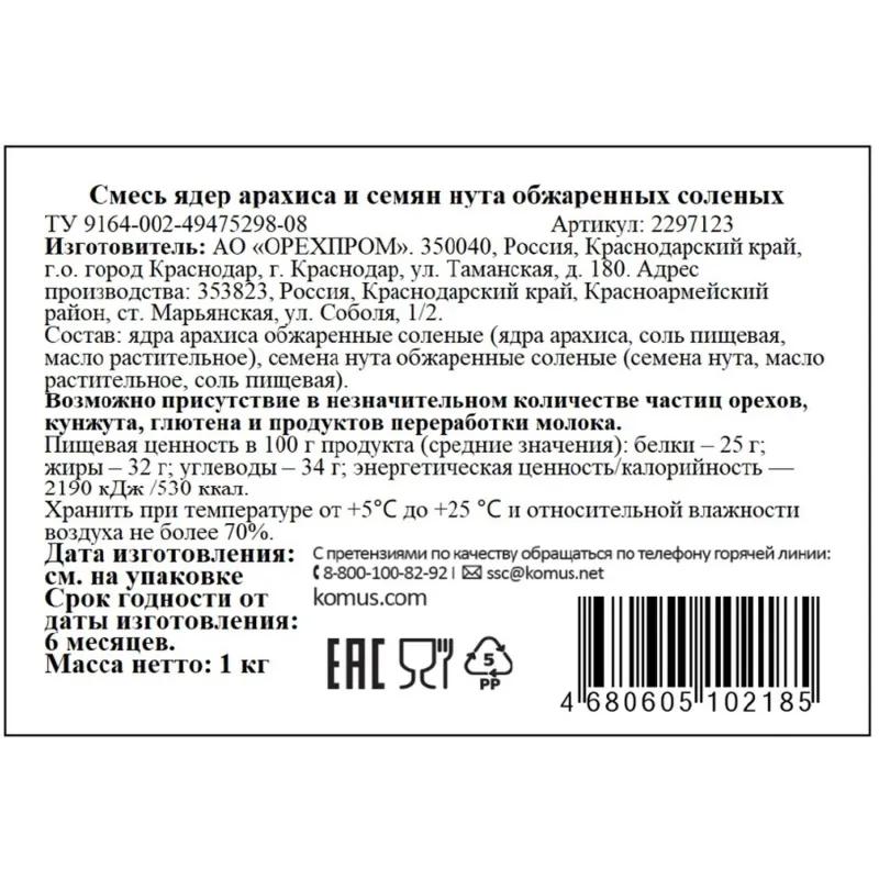 Ореховая смесь из арахиса и нута 1 кг<br><br>Ореховая смесь арахис жареный солёный и нут — питательная и полезная смесь жаренного арахиса и нута с солью. Семена нута богат питательными веществами, такими как белки, клетчатка, витамины и минералы. Жарение нута придаёт ему необыкновенную хруст и неповторимый аромат. Жареный арахис с солью — это хрустящий и солоноватый снек, который станет отличным дополнением. Ореховая смесь арахис жареный солёный и нут — продукт, который можно использовать как самостоятельный перекус или в составе различных кулинарных рецептов.<br>Состав: ядра арахиса обжаренные солёные (ядра арахиса, соль пищевая, масло растительное), семена нута обжаренные солёные (семена нута, масло растительное, соль пищевая).<br>Возможно присутствие в незначительном количестве частиц орехов, кунжута, глютена и продуктов переработки молока.<br>Пищевая ценность: белки — 25 г; жиры — 32 г; углеводы — 34 г.<br>Энергетическая ценность: 530 ккал/2190 кДж.<br>Срок годности от даты изготовления: 6 месяцев.<br>Хранить при температуре от +5 до +25°C и относительной влажности воздуха не более 70%.<br><br>Внешний вид и/или характеристики товара могут быть изменены производителем в соответствии с производственным процессом.