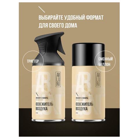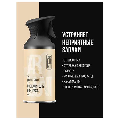 Освежитель воздуха 250мл ARLUNI "Жасмин и ваниль" с триггером – это эффективный аэрозольный ароматизатор для помещений.Универсальные духи для дома и машины Арлуни станут отличным решением для создания приятной атмосферы в офисе или квартире. Освежитель воздуха для туалета эффективно устраняет неприятные запахи и моментально ароматизирует пространство. Ароматизатор для дома парфюмированный разработан на основе эффективной формулы на спирте, которая обеспечивает продукту сухое распыление, не оставляющее следов.