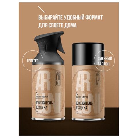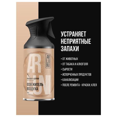 Освежитель воздуха 250мл ARLUNI "Кашемир и дерево" с триггером – это эффективный аэрозольный ароматизатор для помещенийУниверсальные духи для дома и машины Арлуни станут отличным решением для создания приятной атмосферы в офисе или квартире. Освежитель воздуха для туалета эффективно устраняет неприятные запахи и моментально ароматизирует пространство. Ароматизатор для дома парфюмированный разработан на основе эффективной формулы на спирте, которая обеспечивает продукту сухое распыление, не оставляющее следов.