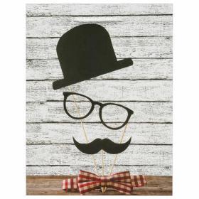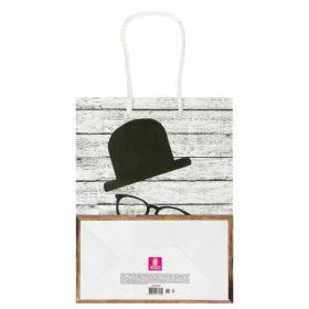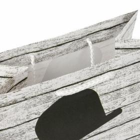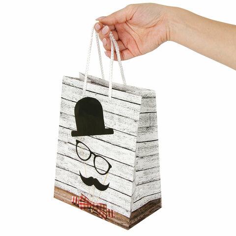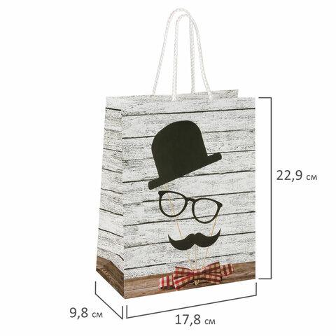 Изготовлен из ламинированной мелованной бумаги с веревочными ручками из полипропилена. Размер – 18x10x23 см. Пакет выполнен в черно-белых и коричневых тонах с изображением мужской атрибутики: шляпы котелка, очков, усов, галстука-бабочки.