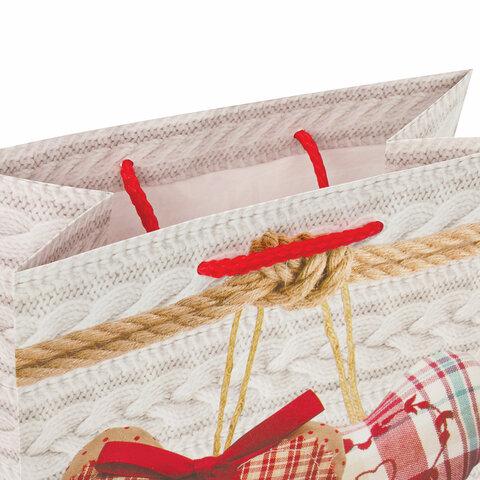 Изготовлен из ламинированной мелованной бумаги с веревочными ручками из полипропилена. Размер – 18x10x23 см. Пакет выполнен в белых и красных тонах с изображением двух сердец.