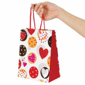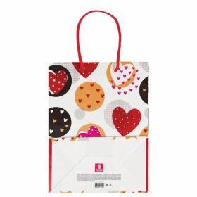 Изготовлен из ламинированной мелованной бумаги с веревочными ручками из полипропилена. Размер – 18x10x23 см. Пакет выполнен в белых, красных и черных тонах с изображением сердец.