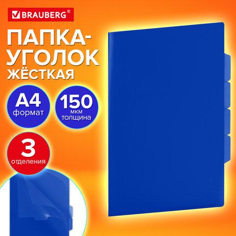 Папка-уголок BRAUBERG предназначена для хранения и транспортировки документов и является незаменимым атрибутом для студента, школьника или офисного работника.Папка формата А4 выполнена из высококачественного полипропилена плотностью 150 мкм. Она предотвращает смятие, загрязнение или намокание бумаг. Имеет 3 отделения, разделенных ярлычками. Непрозрачный материал способен скрыть содержимое от посторонних глаз. Данная папка заметно выделяется среди других благодаря насыщенному синему цвету.