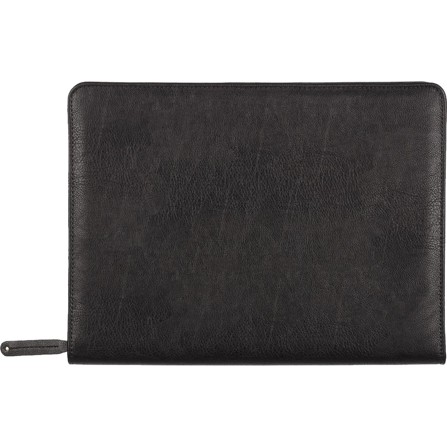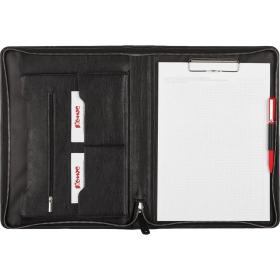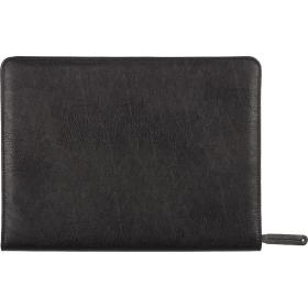 Папка деловая Алекс изготовленная из экокожи чёрного цвета — стильный и функциональный аксессуар для представителей офиса. Папка закрывается на металлическую молнию по периметру. Внутри имеется объёмный карман для документов, большой карман на молнии, а также карманы для мелких документов и визиток и отрывной блок для записей.<br>Размер: 34×26×2.5 см.