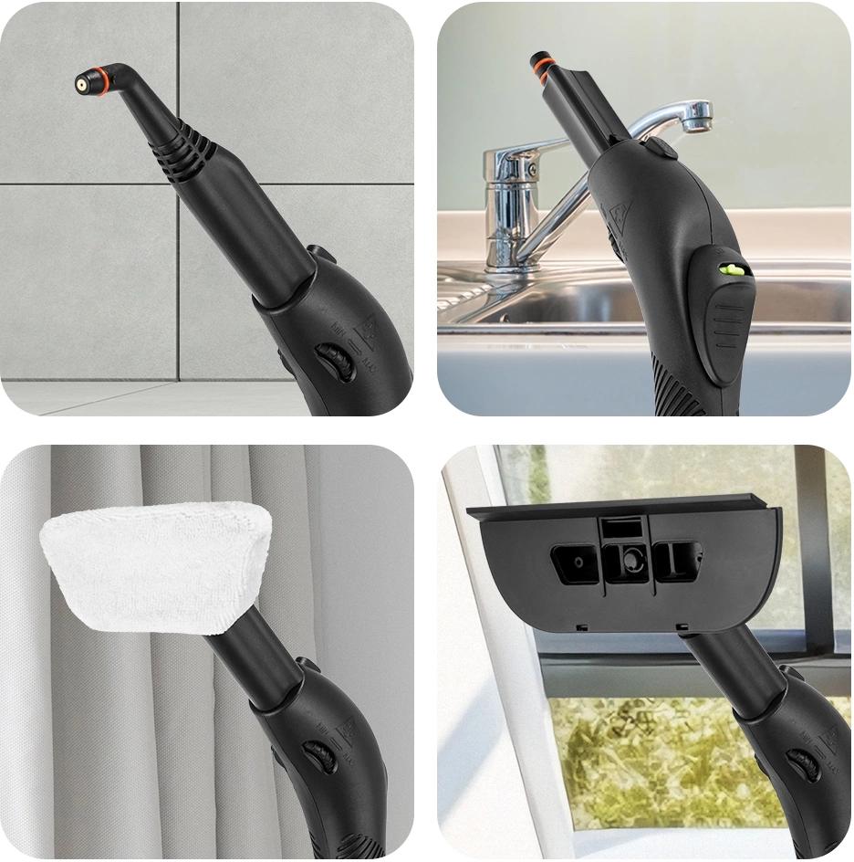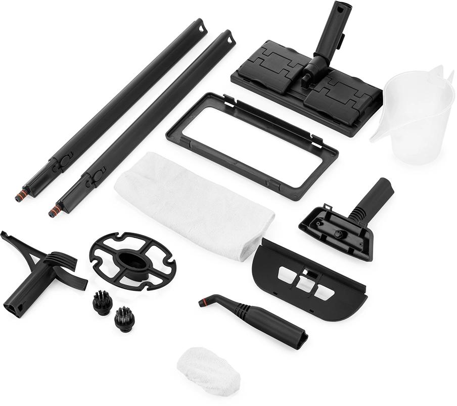 | Насадки в комплекте | насадка для пола, тряпка для пола, рамка для ковра, нейлоновая щетка, стальная щетка, струйная насадка, держатель для вешалок, держатель шнура, насадка со скребком, насадка для отпаривания, тряпка для отпаривания |