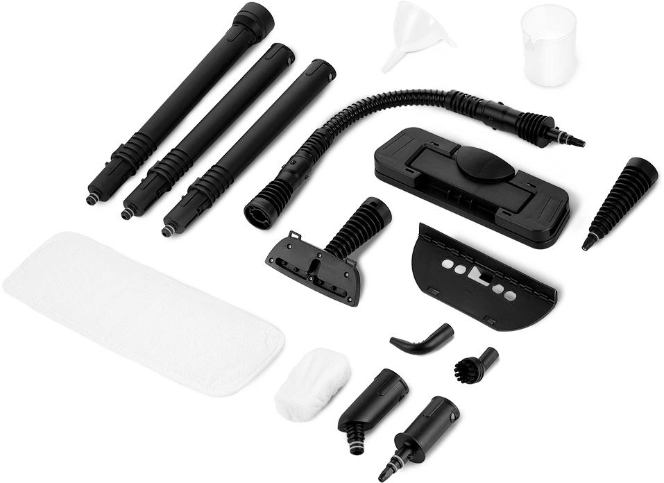 | Насадки в комплекте | Струйная насадка, напольная щетка, напольная тряпка, насадка для отпаривания, тряпка для отпаривания, насадка с резиновым скребком, нейлоновая щетка, угловая насадка |