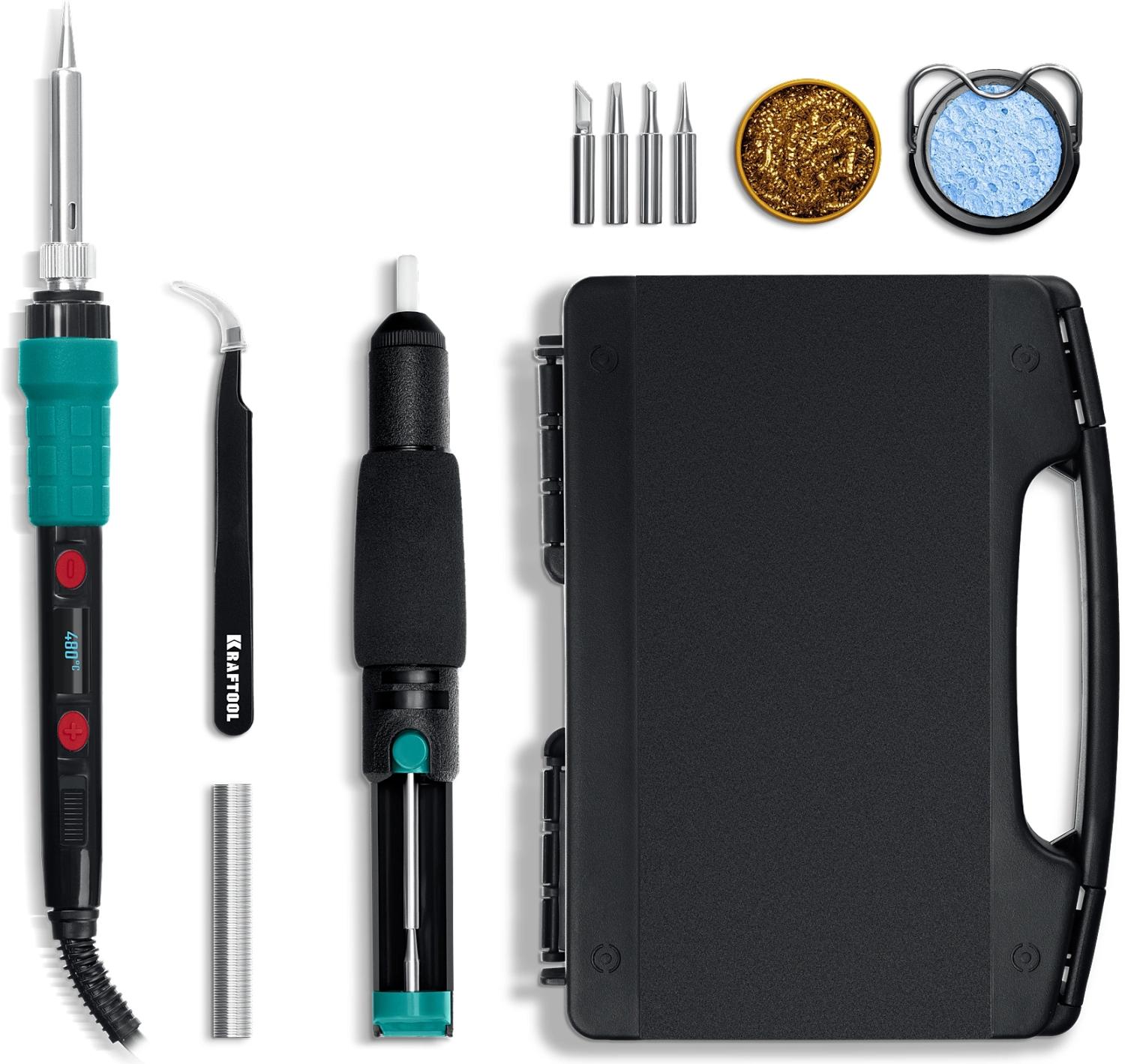 Паяльная станция Kraftool KS-15 (55346)<br><br>Паяльная станция применяется для паяльных работ, требующих бережную пайку при определённой температуре. Станция особенно удобна при пайке электронных плат и других мелких деталей, поскольку поддерживает заданную температуру и не нуждается в отключении от электросети во время работы. На ЖК-дисплее отображается процесс нагревания/остывания и температура жала паяльника. Выключатель обеспечивает удобство эксплуатации паяльной станции.<br><br>Преимущества<br>• Компактная модель паяльной станции и с точной установкой и возможностью калибровки температуры<br>• Высококачественный керамический нагревательный элемент для быстрого достижения необходимой температуры жала<br>• Точная регулировка температуры в пределах от 90°С до 480°С<br>• Кнопка включения/выключения питания<br>• Жало с встроенным керамическим нагревательным элементом<br>• Двухкомпонентная рукоятка<br><br>Комплектация<br>• Мини-станция паяльная<br>• Подставка<br>• Сменные жала (5 шт.)<br>• Оловоотсос<br>• Пинцет<br>• Припой, 12 гр.<br>• Канифоль<br>• Губка для лужения и чистки жал<br>• Коврик для чистки жал<br>• Кейс<br>• Руководство по эксплуатации<br><br>Внешний вид и/или характеристики товара могут быть изменены производителем в соответствии с производственным процессом.