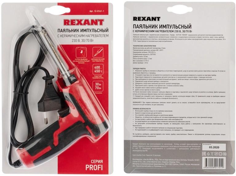 | Особенности | Импульсный паяльник с двумя режимами мощности 30/70 Вт удобен для распайки кабелей и демонтажных работ. |