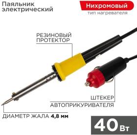 | Описание | Паяльник "Rexant" с штекером автоприкуривателя предназначен для ручного монтажа радиоэлементов. Подключается в разъем прикуривателя автомобиля, что позволяет производить пайку без подключения к сети 220В. Рабочее напряжение 12В делает работу безопасной. |