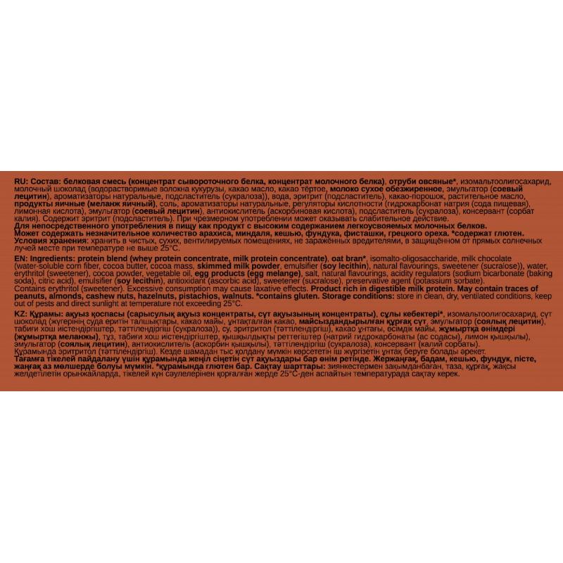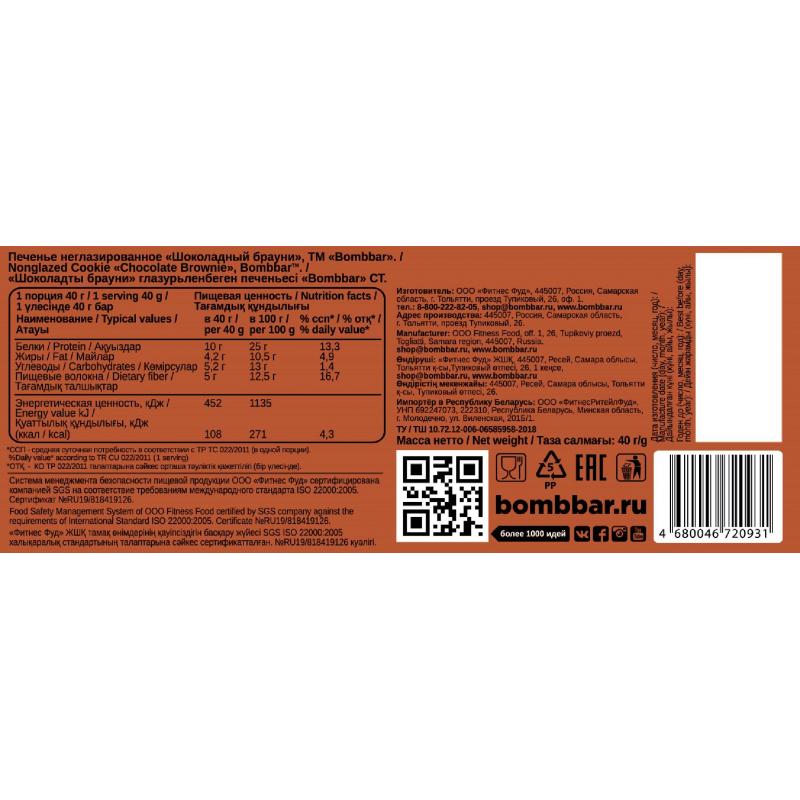 Мечтаете о «Брауни», но считаете калории? Печенье Bombbar создано специально для легких и полезных перекусов. Это нежное печенье с натуральным шоколадом, в котором нет ни грамма сахара или пшеничной муки.Состав: белки молочные (концентрат сывороточного белка, концентрат молочного белка), водорастворимые волокна кукурузы, белый шоколад(водорастворимые волокна кукурузы, какао масло, молоко сухое цельное, молоко сухое обезжиренное, эмульгатор(соевый лецитин), ароматизаторы натуральные, подсластитель(стевиолгликозиды)), кокосовое масло, вода, подсластители(эритрит, сорбит), какао порошок алкализованный, продукты яичные (меланж яичный), агент влагоудерживающий (глицерин), соль, ароматизаторы натуральные, краситель натуральный, регуляторы кислотности (гидрокарбонат натрия(сода пищевая), лимонная кислота), эмульгатор(соевый лецитин), антиокислитель (аскорбиновая кислота), подсластитель (стевиолгликозиды).