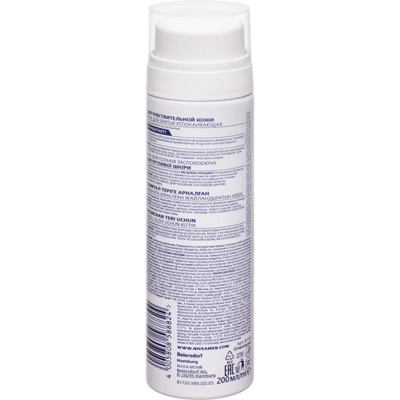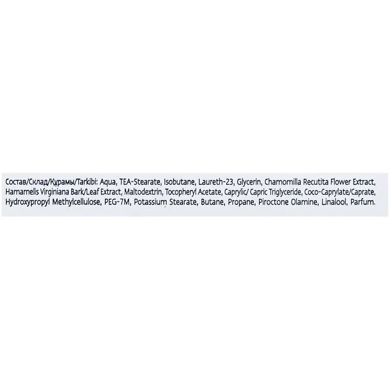 Успокаивающая пена для бритья, обогащенная экстрактом ромашки и гамамелиса.<br><br>Преимущества:<br>— Предотвращает пять признаков раздражения кожи: жжение, покраснение, сухость, ощущения стянутости и зуда;<br>— не содержит спирта и поэтому идеально подходит для чувствительной кожи;<br>— обеспечивает ультрагладкое бритье.<br><br>Состав: Aqua, TEA-Stearate, isobutan, Laureth-23, Giycerin, Chamomilla Recutita Flower Extract, Hamamelis, Virginiana Bark/Leaf Extract, Maltodextrin, Tocopheryl Acetate, Caprylic/Capric Triglyceride, Coco-Caprylate/Caprate, Hydroxypropyl Methylcellulose, PEG-7M, Potassium Stearate, Butane, Propane, Piroctone Olamine, Linalool, Parfum.<br><br>Объем: 200 мл.