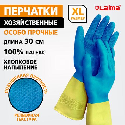 Универсальные особо прочные латексные перчатки LAIMA защищают руки от воздействия грязи, влаги, моющих и чистящих средств при любых бытовых и хозяйственных работах: мытьё посуды, стирка белья, уборка, садоводческая работа и т.д.Особо прочные перчатки с высокой износостойкостью для долговременного использования. Изготовлены из прочного латексного материала, который защищает руки от внешних воздействий при проведении любых хозяйственно-бытовых работ. Текстура на ладони и пальцах помогает улучшить сцепление и препятствует выскальзыванию предметов из рук. Внутреннее хлопковое напыление позволяет надевать перчатки даже на влажные руки, а также обеспечивает комфорт во время использования.