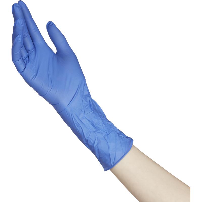 Перчатки нитриловые одноразовые защитные, неопудренные, нестерильные. Удлиненные, длина перчатки 30 см. Размер: 9, L. Для контакта с пищевой продукцией и предотвращения контакта с пищевой продукцией кожного покрова рук. Количество в упаковке: 100 штук/50 пар Имеется регистрационное удостоверение на медицинское изделие.