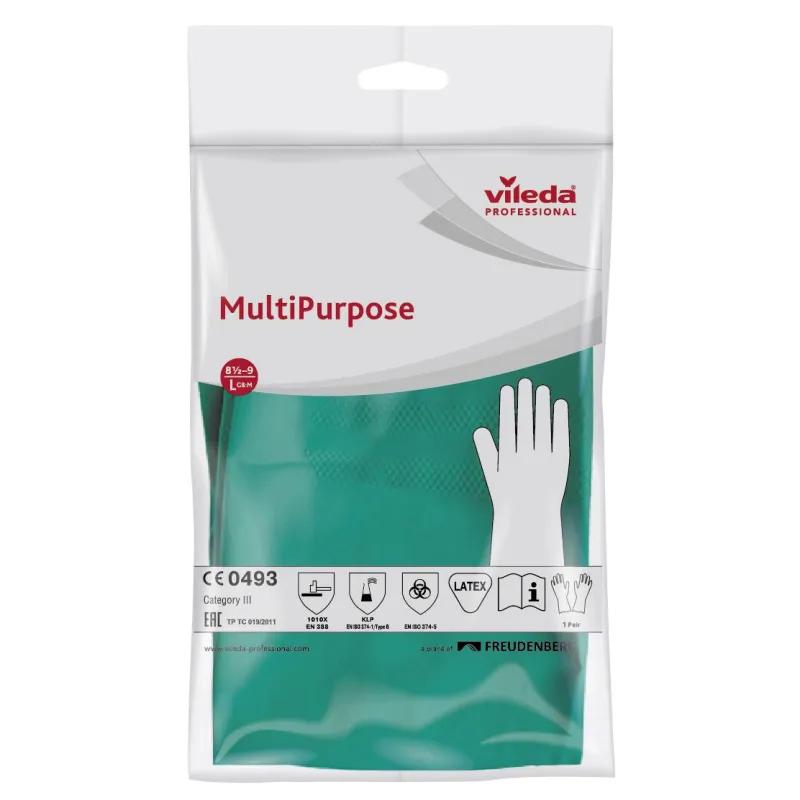 Перчатки Многоцелевые от Vileda Professional из латекса, размер L, предназначены для профессиональной уборки и другого широкого круга задач, включая уборку помещений и работу с продуктами питания. Защищают от вирусов. Перчатки Многоцелевые эффективно защищают руки во время уборки. Подходят для использования с разведенными моющими средствами и дезинфектантами. Желтые и синие перчатки с ограничением подходят для работы с продуктами питания в столовых, кафе, барах и на кухнях. Применимы для работы на сухих и влажных участках. Особенности и преимущества: Высокая сопротивляемость химикатам и моющим средствам - класс Type B- KLP по стандарту EN ISO 374-1. Износостойкие и долговечные - протестированы на механическую защиту тип 1010Х по стандарту EN 388. Защищают от бактерий, возбудителей грибковых заболеваний и вирусов. Протестированы по стандарту EN 374-5 на герметичность. Соответствуют EAC ТР ТС 019/2011. СЕ Категория III- максимальная защита от рисков по европейским стандартам. Цветовая кодировка для исключения перекрестных загрязнений. Высокая прочность натурального латекса и удобная анатомическая посадка для максимального комфорта. Хлопковое напыление внутри для комфорта во время работы и легкого надевания и снятия перчатки. Плотные и эластичные, приятные на ощупь. Не имеют резкого специфичного запаха резины. Рельефная сетчатая структура на ладонях и пальцах для надежного захвата. Аккуратный волнообразный обрез манжеты. Можно стирать и сушить. Область применения: Идеальны для уборки коммерческой и некоммерческой недвижимости, объектов здравоохранения, производств и HoReCa. Перчатки латексные Многоцелевые - это высококачественный инструмент для эффективной, экологичной и профессиональной уборки. Характеристики: Размер: длина - 29 см, ширина - 11,2 см. Толщина: синие, красные, желтые - 0,4 мм по гладкой стороне, зеленые - 0,5 мм по гладкой стороне. Вес: средний вес 1 перчатки - 32 г, пары в упаковке - 61,5 г. (зависит от размера). Состав: латекс (натуральная резина), наполнитель, вулканизирующие агенты, стабилизаторы, оксид цинка, цветовые пигменты, хлопковое напыление, ZDEC (диэтилдитиокарбамат цинка). Обрез манжеты: волнообразный. Рельефный рисунок: сетка чешуйчатая на ладонях и пальцах. Ориентация: анатомическая (левая и правая). Страна производства: Малайзия.