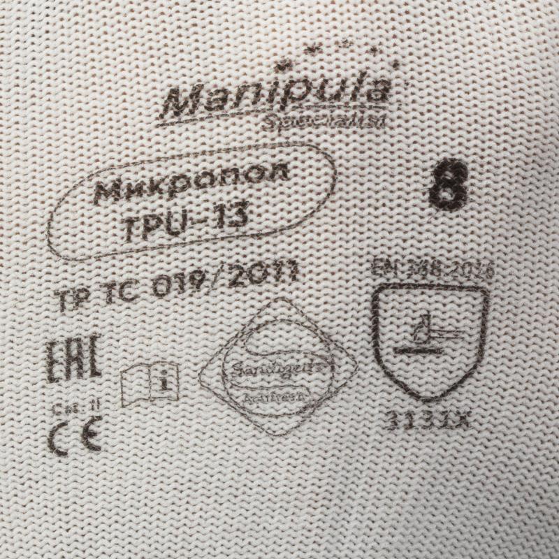 Перчатки рабочие защитные Manipula Specialist Микропол TPU-13/MG-162 нейлоновые с полиуретановым покрытием белые (13 нитей, 13 класс, размер 8, М). Длина перчаток: 240 мм. Класс вязки: 13. Число нитей: 13. Перчатки предназначены для защиты рук от порезов, механических воздействий, а также от воздействия нефти и нефтепродуктов. Они используются в различных отраслях, таких как нефтегазовая, строительная промышленность, а также при работах, где требуется защита от механических повреждений и воздействия химических веществ.Материалы и покрытия:- Бесшовная основа из нейлона с плотностью вязки 13 петель на дюйм для отличной тактильной чувствительности.- Полиуретановое покрытие, которое предотвращает проскальзывание предметов и дает эффект 'липкости'.- В покрытии не используется силикон, который может оставить следы на поверхности изделий.- Полимерное покрытие прошло проверку на стойкость к нефтепродуктам (Нс, Нм).Особенности:- Анатомическая форма перчаток снижает усталость рук.- Двойной оверлок с цветовой индикацией размера.- Антибактериальная обработка Sanitized Actifresh для предотвращения неприятных запахов и микробной среды.Эксплуатационный уровень: EN 388-3131X.Защитные свойства ТР ТС:- Ми - защита от истирания.- Мп - защита от проколов.- Нс - защита от нефти.- Нм - защита от нефтепродуктов.Соответствует стандартам:- ТР ТС 019/2011.- ГОСТ 12.4.252-2013.- ГОСТ EN 388-2016.- ГОСТ EN 420-2003+A1-2009.- ГОСТ P ЕН 1149-5-2008.Цвет на изображении товара может отличаться от реального из-за особенностей цветопередачи монитора.ЗАКОНОДАТЕЛЬНЫЕ И ТЕХНИЧЕСКИЕ ДОКУМЕНТЫ: