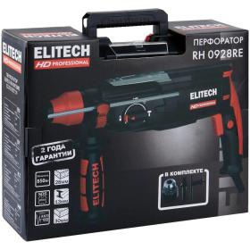 Перфоратор сетевой Elitech HD RH 0928RE (E2205.027.01, 205381)<br><br>Elitech «HD Professional» — серия инструментов для интенсивной работы, требующей высочайшей точности исполнения. Инструменты серии «HD Professional» сохраняют функциональность в экстремальных условиях окружающей среды. Они имеют максимальные степени защиты от перепадов температуры, влаги, пыли, перегрузок. Отличаются высокой ремонтопригодностью и высоким ресурсом. Созданы для профессионалов и для экстремальных условий<br><br>Перфоратор Elitech HD RH 0928RE мощностью 850 Вт со скоростью вращения 0-1150 об/мин и частотой ударов 0-5150 уд/мин, предназначен для бурения отверстий, штробления пазов, разрушения твёрдых материалов, таких как кирпич, бетон, природный и искусственный камень и т.п. 3 режима работы (сверление, сверление с ударом, долбление). В качестве рабочих насадок в перфораторе с патроном SDS-Plus могут использоваться бур, пика или зубило.<br><br>Особенности<br>• Мощность 850 Вт<br>• Максимальный диаметр сверления в бетоне 28 мм<br>• Максимальный диаметр сверления в стали 13 мм<br>• Максимальный диаметр сверления в дереве 30 мм<br>• Патрон SDS-plus<br>• Реверс<br><br>Комплектация<br>• Перфоратор;<br>• Рукоятка дополнительная;<br>• Ограничитель глубины сверления;<br>• Патрон ЗВП;<br>• Адаптер патрона;<br>• Ключ патрона ЗВП;<br>• Кейс;<br>• Паспорт изделия.<br><br>Внешний вид и/или характеристики товара могут быть изменены производителем в соответствии с производственным процессом.