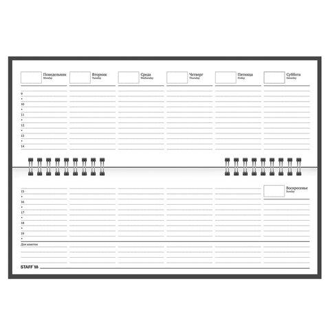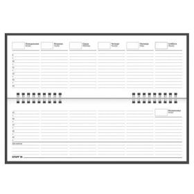 Настольный планинг STAFF предназначен для ведения записей. Благодаря отсутствию дат его можно использовать в любое время года.Внутренний блок содержит 64 листа офсетной бумаги белого цвета плотностью 55 г/м2. Обложка из бумвинила и твердый переплет обеспечивают долгий срок службы. Подходит для тиснения фольгой. Скрепление осуществляется с помощью евроспирали. Размер изделия - 285х112 мм.