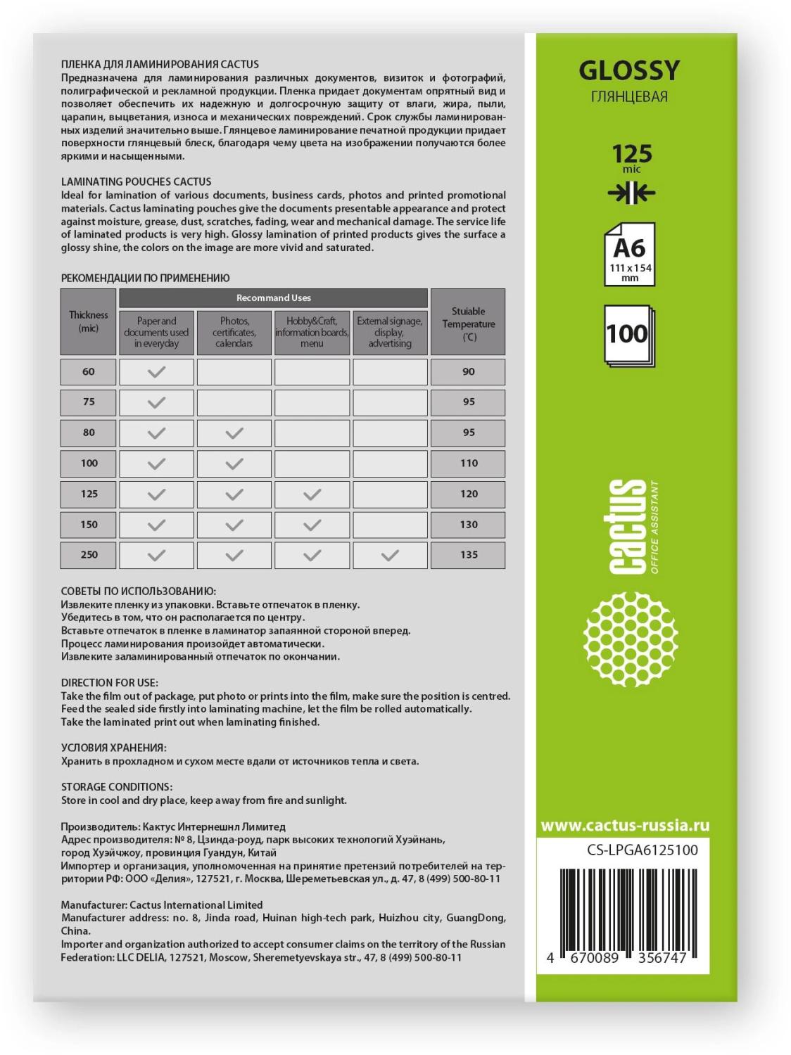 Пленка для ламинирования Cactus 125мкм A6 (100шт) глянцевая 111x154мм CS-LPGА6125100 / 4dealer.ru