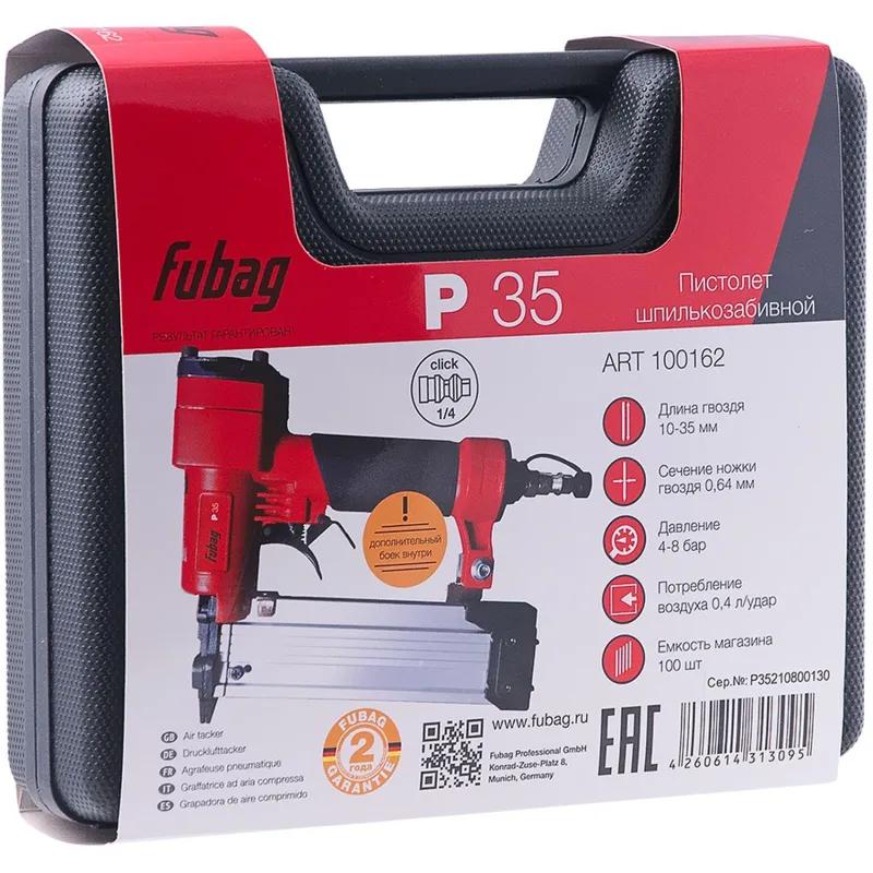 Пистолет гвоздезабивной Fubag P35 (100162)<br><br>Шпилькозабивной пистолет Fubag P35 может вбивать шпильки длиной до 35 мм для работы с толстым деревянным покрытием.<br><br>Предохранительный стопор защищает от случайного пуска и делает работу безопасной.<br><br>Нескользящее покрытие на рукоятке обеспечивает надёжный охват.<br><br>Внешний вид и/или характеристики товара могут быть изменены производителем в соответствии с производственным процессом.
