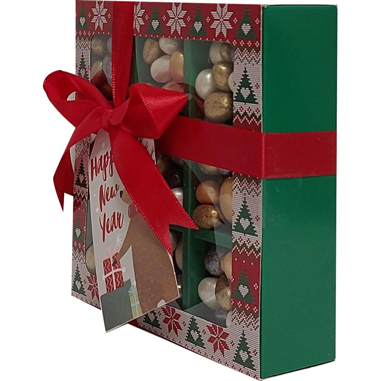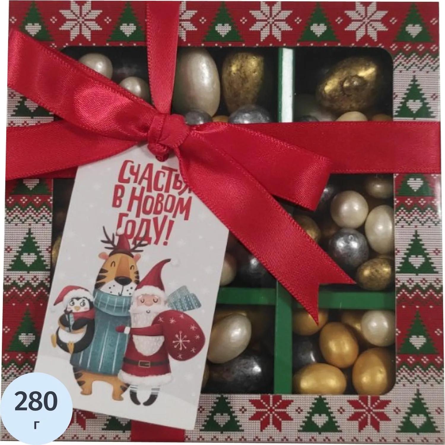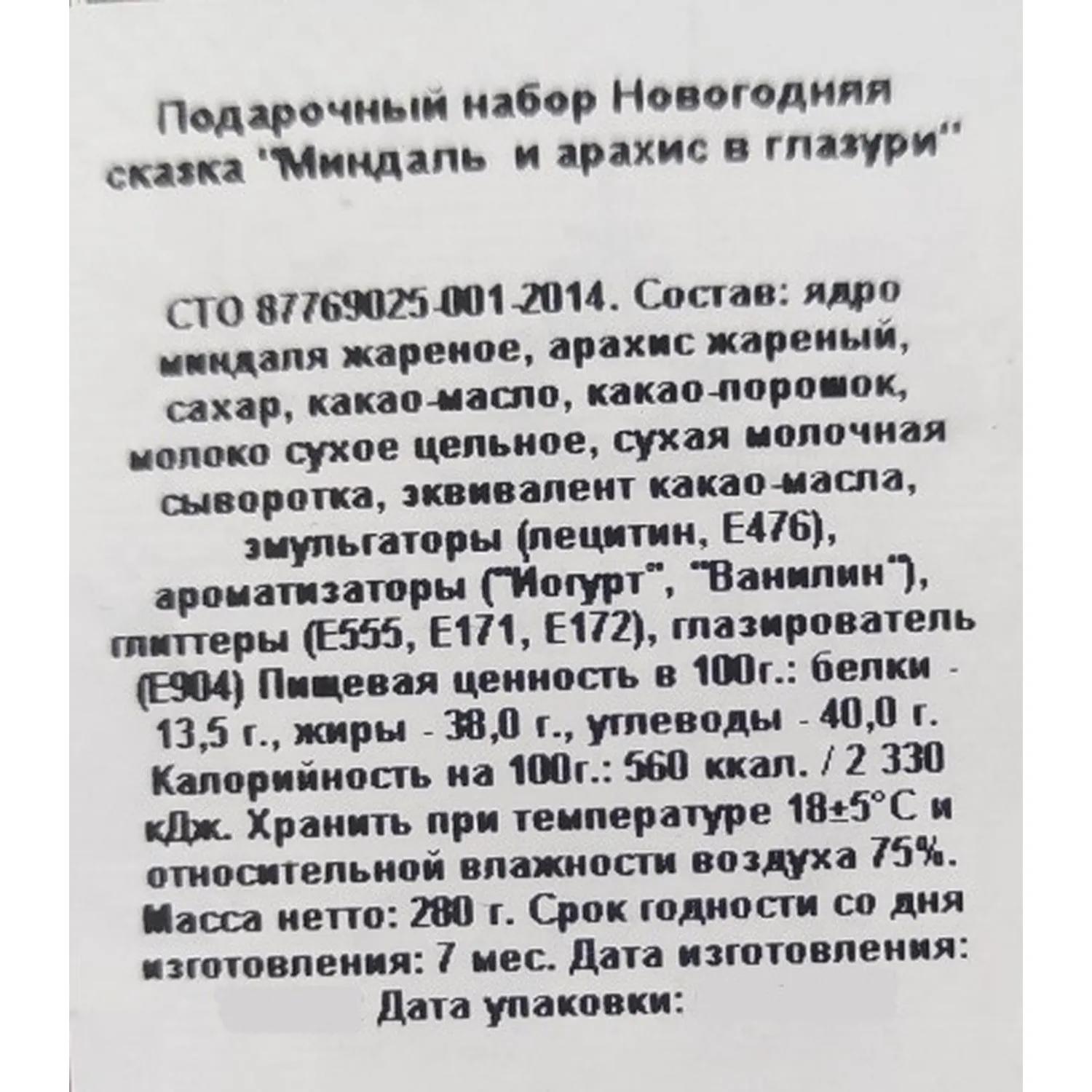 Подарочный набор Зелёная улица Новогодняя сказка миндаль и арахис в глазури 280 г<br><br>Подарите себе или близким настоящее новогоднее волшебство с уникальной подарочной коробкой! Этот подарок идеально подойдёт для любого, кто ценит приятные моменты и заботится о себе.<br>Состав: ядро миндаля жареное, арахис жареный, сахар, какао-масло, какао-порошок, молоко сухое цельное, сухая молочная сыворотка, эквивалент какао-масла, эмульгаторы (лецитин, Е476), ароматизаторы («Йогурт», «Ванилин»), глиттеры (Е555, Е171, Е172), глазирователь (Е904).<br>Пищевая ценность на 100 г: жиры — 38,0 г, углеводы — 40,0 г, белки — 13,5 г.<br>Энергетическая ценность на 100 г: 560,00 ккал.<br>Условия хранения: в чистых, сухих, без постороннего запаха помещениях при температуре не выше (18±5)°С и относительной влажности воздуха не более 75%.<br>Страна производства: Россия.<br><br>Внешний вид и/или характеристики товара могут быть изменены производителем в соответствии с производственным процессом.