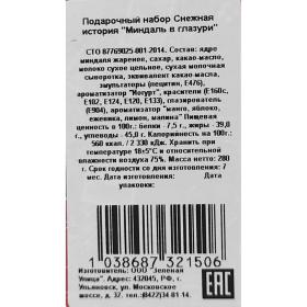 Подарочный набор Зелёная улица Снежная история миндаль в глазури 280 г<br><br>Подарите себе или близким настоящее новогоднее волшебство с уникальной подарочной коробкой! Этот подарок идеально подойдёт для любого, кто ценит приятные моменты и заботится о себе.<br>Состав: ядро миндаля жареное, сахар, какао-масло, молоко сухое цельное, сухая молочная сыворотка, эквивалент какао-масла, эмульгаторы (лецитин, Е476), ароматизатор «Йогурт», красители (Е160с, Е102, Е124, Е120, Е133), глазирователь (Е904), ароматизатор «манго, яблоко, ежевика, лимон, малина».<br>Пищевая ценность на 100 г: жиры — 39,0 г, углеводы — 45,0 г, белки — 7,5 г.<br>Энергетическая ценность на 100 г: 560,00 ккал.<br>Условия хранения: в чистых, сухих, без постороннего запаха помещениях при температуре не выше (18±5)°С и относительной влажности воздуха не более 75%.<br>Страна производства: Россия.<br><br>Внешний вид и/или характеристики товара могут быть изменены производителем в соответствии с производственным процессом.
