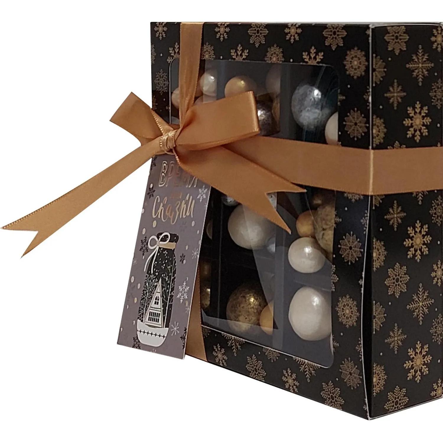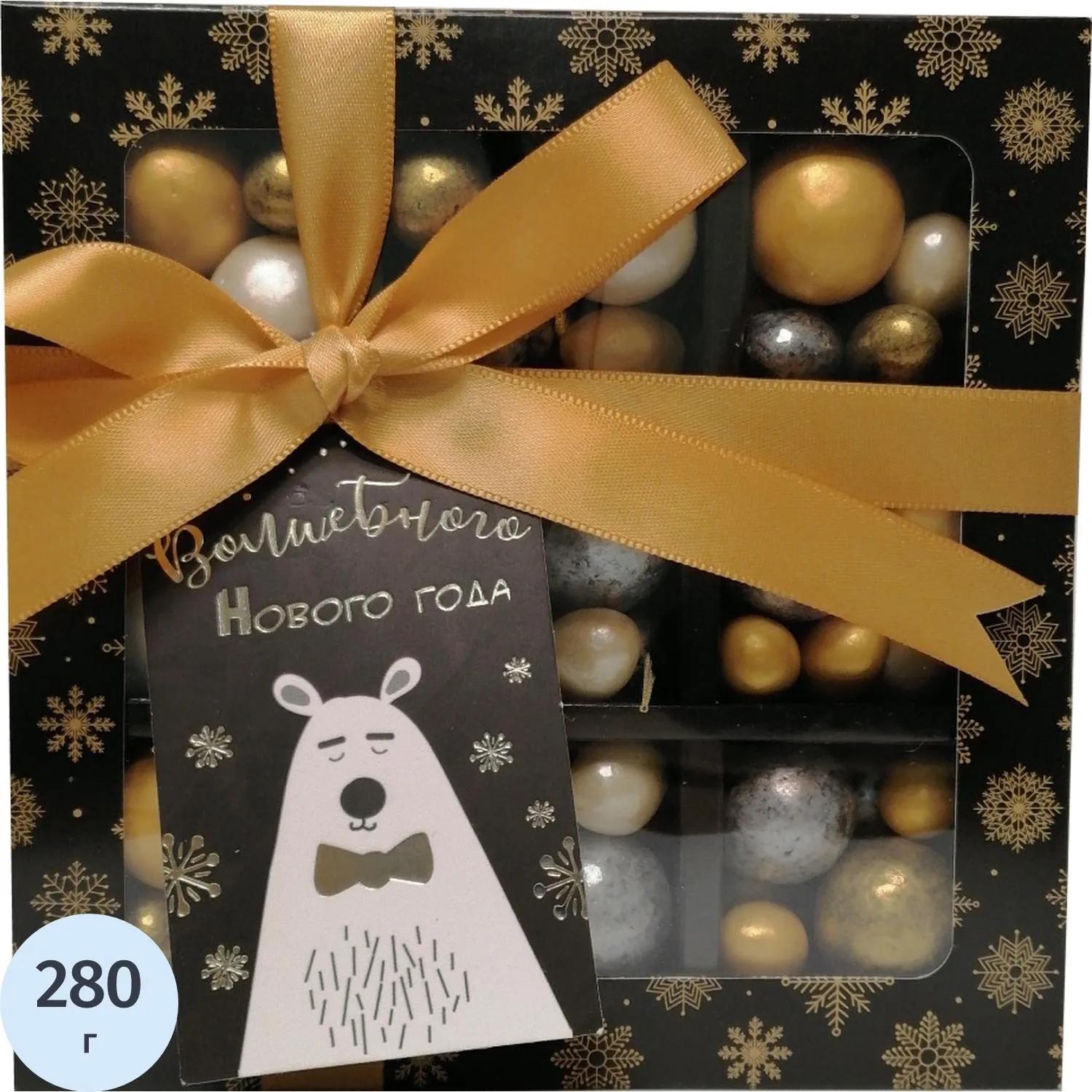Подарочный набор Зелёная улица Волшебство в глазури 280 г<br><br>Подарите себе или близким настоящее новогоднее волшебство с уникальной подарочной коробкой! Этот подарок идеально подойдёт для любого, кто ценит приятные моменты и заботится о себе.<br>Состав: ядро фундука жареное, арахис жареный, сахар, какао-масло, какао-порошок, молоко сухое цельное, сухая молочная сыворотка, эквивалент какао-масла, эмульгаторы (лецитин, Е476), ароматизаторы («Йогурт», «Ванилин»), глиттеры (Е555, Е171, Е172), глазирователь (Е904).<br>Пищевая ценность на 100 г: жиры — 38,0 г, углеводы — 40,0 г, белки — 13,5 г.<br>Энергетическая ценность на 100 г: 560,00 ккал.<br>Условия хранения: в чистых, сухих, без постороннего запаха помещениях при температуре не выше (18±5)°С и относительной влажности воздуха не более 75%.<br>Страна производства: Россия.<br><br>Внешний вид и/или характеристики товара могут быть изменены производителем в соответствии с производственным процессом.