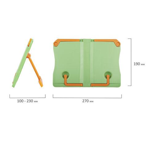 Подставка для книг и учебников ЮНЛАНДИЯ cтанет незаменимым помощником для школьников и любителей чтения. Использование подставки для книг способствует правильному формированию осанки.Изготовлена из прочного пластика. Регулируемый угол наклона обеспечивает удобство при работе с текстом, облегчает чтение и подготовку домашней работы. Раскладные верхние планки позволяют размещать книги большого формата. Нижние держатели регулируется в зависимости от толщины книги. Блокиратор позволяет надежно зафиксировать подставку на столе и не позволит ей упасть от тяжести книги. Размер подставки - 19х27 см. Цвет корпуса: светло-зеленый. Цвет держателей: оранжевый.