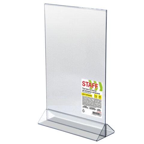 Двусторонняя вертикальная настольная подставка STAFF подходит для размещения меню, рекламных материалов формата А5.Подставка изготовлена из прозрачного ПЭТ. Предназначена для настольного вертикального размещения. Формат А5 и меньше. Максимальная высота вставляемого листа 215 мм, максимальная ширина вставляемого листа 148 мм. Упакована в термоусадочную пленку.