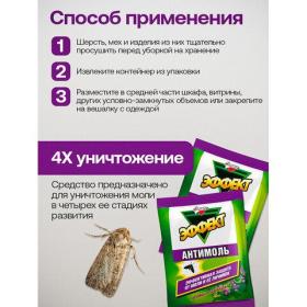 Гибель бабочек моли наступает через 1 неделю. К концу первого месяца достигается гибель гусениц платяной моли. Средство эффективно не более 6 месяцев с момента извлечения из упаковки. Для осуществления длительной защиты изделий от моли следует регулярно заменять упаковку на новую. Средство можно перемещать в разные места в течение срока действия.