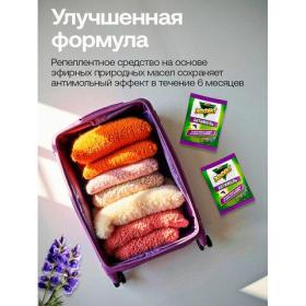 Придает вещам приятный аромат. Сохраняет антимольный эффект в течение 6 месяцев. Удобно в использовании, пригодится в любом домашнем хозяйстве.