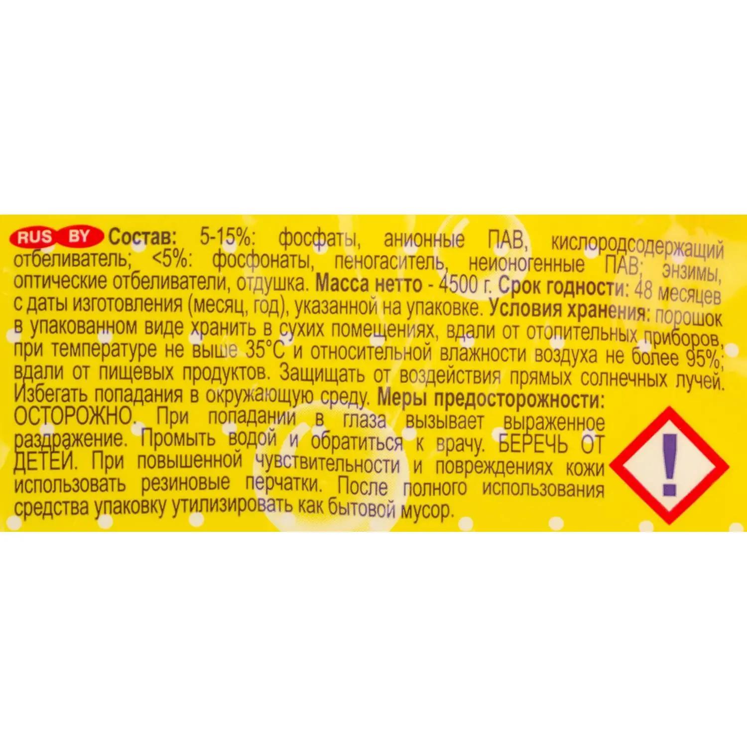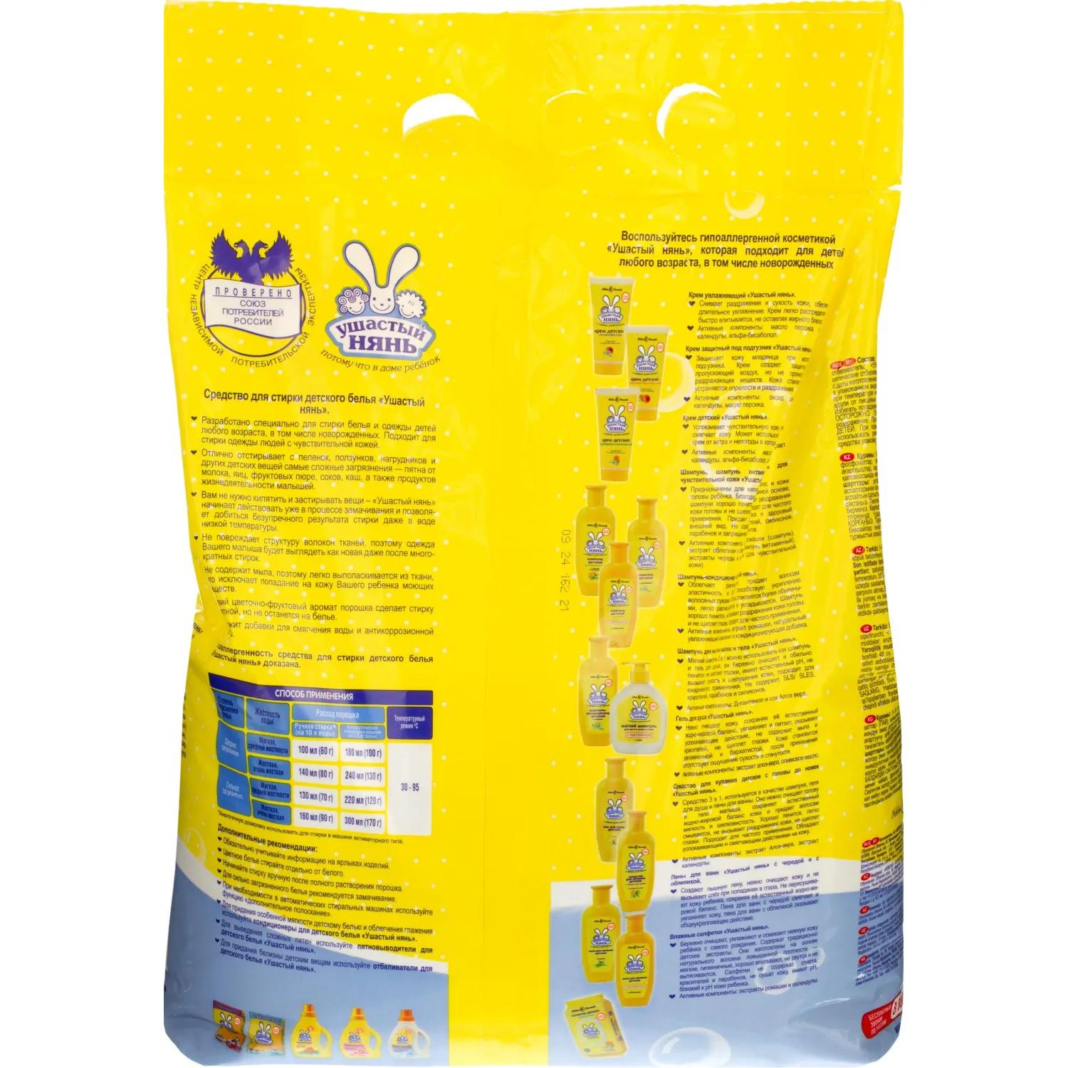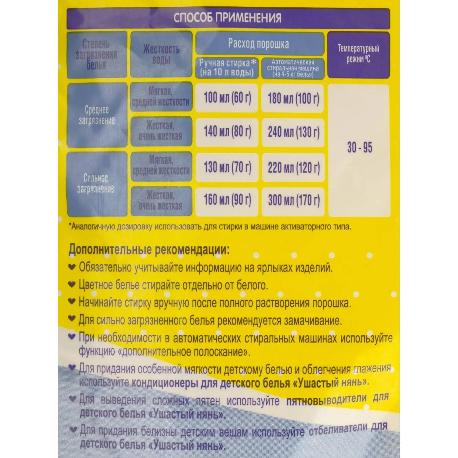 Порошок стиральный автомат для детского белья Ушастый Нянь 4.5 кг для белого и цветного белья<br><br><b>Назначение:</b> предназначено для стирки детских изделий, в том числе новорождённых, из хлопчатобумажных, льняных, синтетических тканей, а также тканей из смешанных волокон (кроме изделий из натурального шёлка и шерсти), вручную, в автоматических стиральных машинах и в машинах активаторного типа.<br><br><b>Способ применения:</b> ручная стирка (на 10 л воды) 30-60 °С: среднее загрязнение: в мягкой/средней жёсткости воде — 100 мл (60 г), в жёсткой/очень жёсткой воде — 140 мл (80 г); сильное загрязнение: в мягкой/средней жёсткости воде — 130 мл (70 г), в жёсткой/очень жёсткой воде — 160 мл (90 г). Автоматическая стиральная машина (на 4-5 кг белья) 30-95 °С: среднее загрязнение: в мягкой/средней жёсткости воде — 180 мл (100 г), в жёсткой/очень жёсткой воде — 240 мл (130 г); сильное загрязнение: в мягкой/средней жёсткости воде — 220 мл (120 г), в жёсткой/очень жёсткой воде — 300 мл (170 г).<br><br><b>Меры предосторожности:</b> беречь от детей. При повышенной чувствительности и повреждениях кожи использовать резиновые перчатки. При попадании в глаза промыть большим количеством воды. После полного использования средства упаковку утилизировать как бытовой мусор.<br><br><b>Состав:</b> 15-30%: кислородсодержащий отбеливатель; 5-15%: фосфаты, анионые ПАВ; <5%: ТАЕД, неионогенные ПАВ; оптический отбеливатель.<br><br><b>Условия хранения:</b> хранить в плотно закрытом флаконе, отдельно от пищевых продуктов, в недоступном для детей месте, при температуре до 35 °С.<br><br><b>Срок годности:</b> 36 месяцев с даты изготовления.