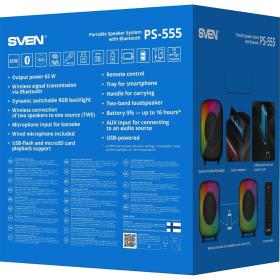 | Наименование для печати | Портативная колонка SVEN PS-555, черный, 65 Вт (RMS), Bluetooth, USB, microSD, пульт |
