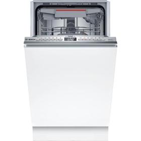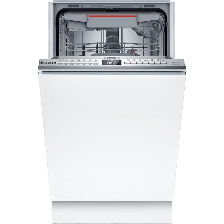 Bosch SPV6EMX65Q обладает шириной всего 44,8 см, встраивается в нишу размером 81,5-87,5х45х55 см. При скромных габаритах позволяет за один раз очистить до десяти комплектов посуды. Для ее размещения используются три корзины и полочка для чашек. Высоту верхнего короба можно менять.