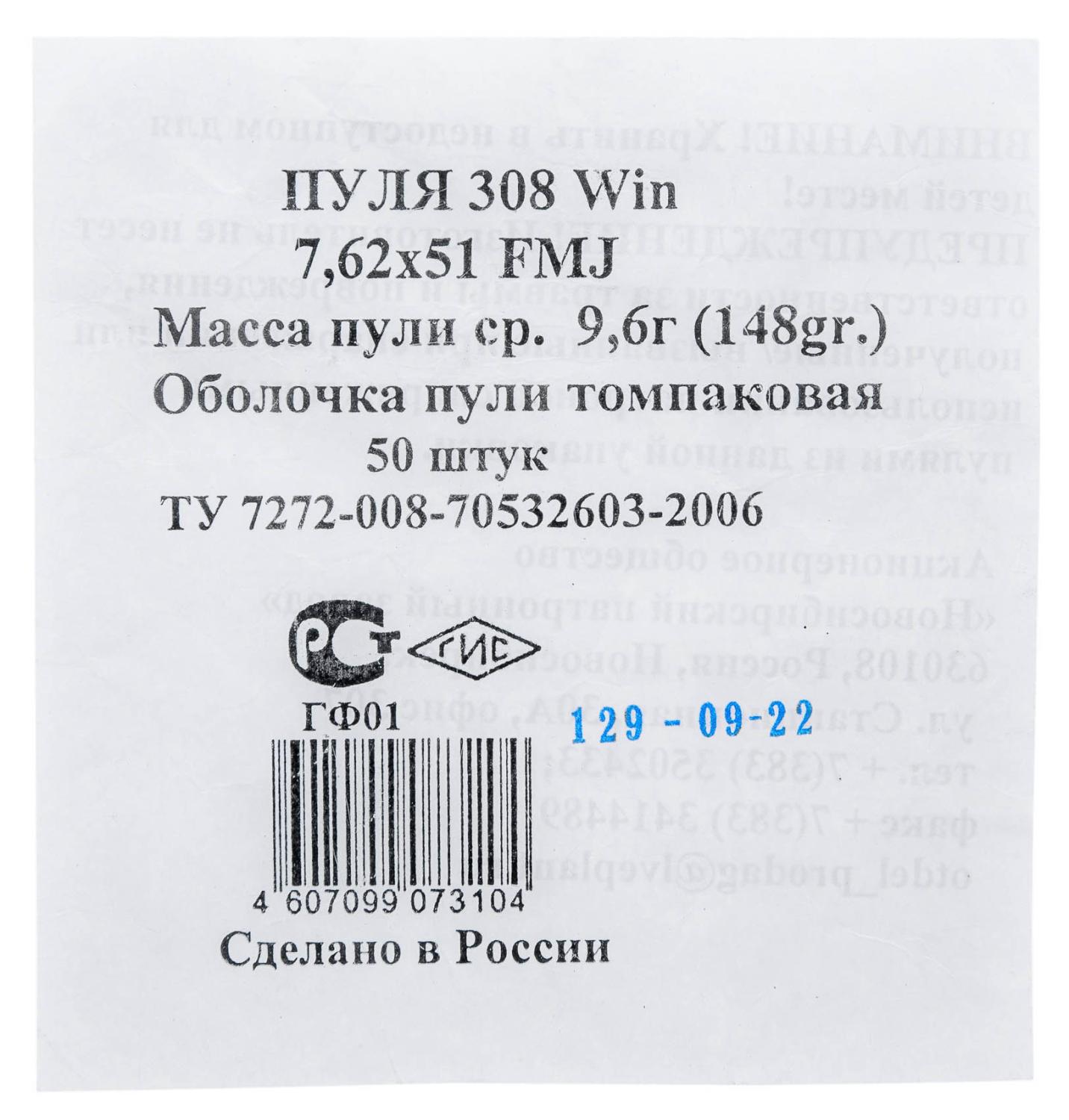 Пуля 308Win 762x51 FMJ НПЗ 96г (148gr) об.томпак (50шт/уп1000шт/кор) / 4dealer.ru