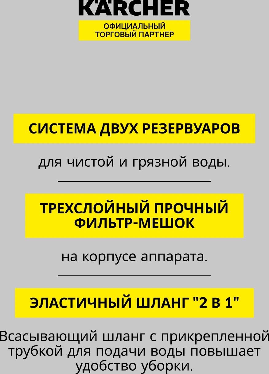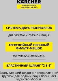| Аксессуары в комплекте | насадка для влажной уборки ковров/полов, насадка для мягкой мебели, насадка для пола и ковров, щелевая насадка |