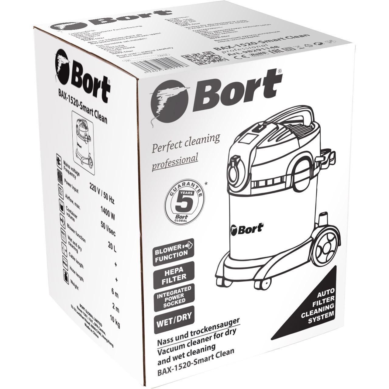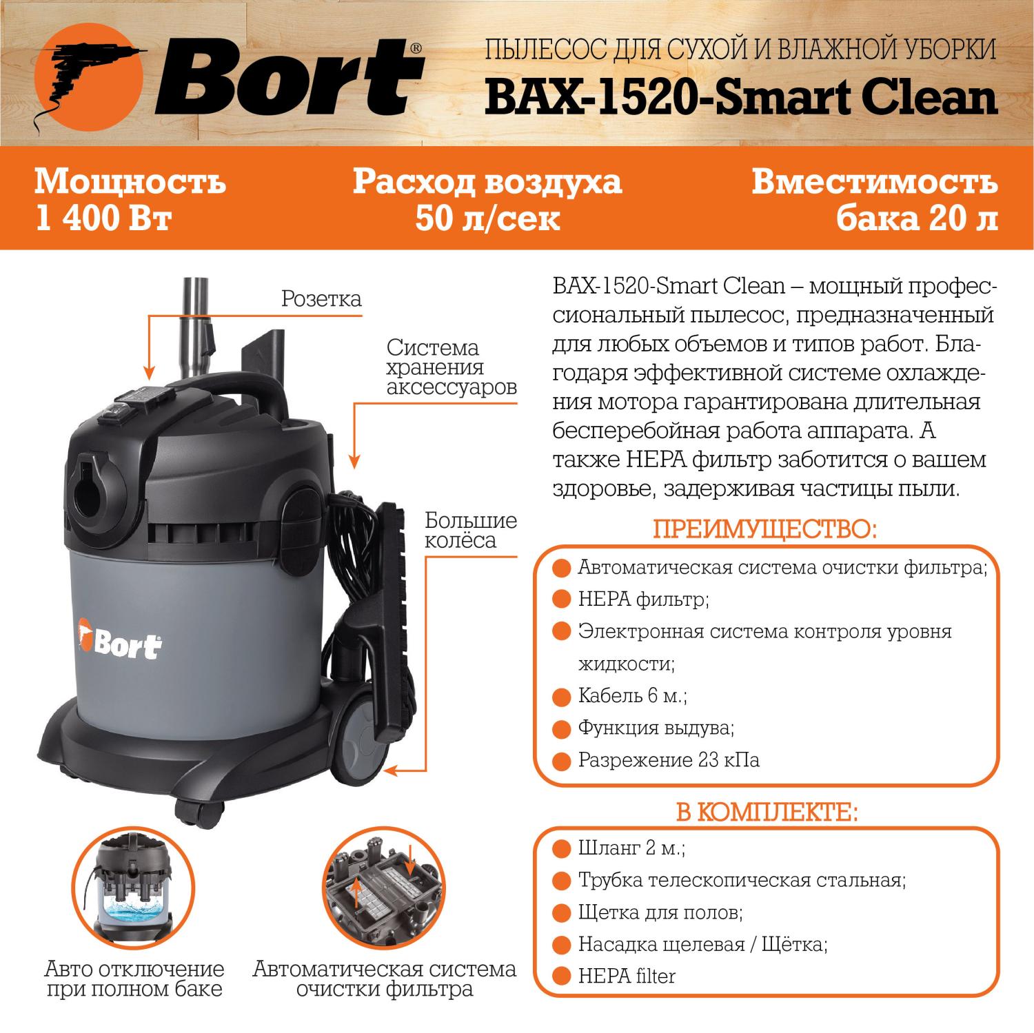 Универсальный пылесос BAX-1520-Smart Clean – мощный профессиональный пылесос, предназначенный для любых объемов и типов работ. Вы сможете использовать функцию сухой или влажной уборки при наведении чистоты в мастерской, подвале, доме, гараже, собрать любое количество воды, убрать мусор после ремонта или очистить наружную территорию. Благодаря высокой производительности и функции автоматической очистки фильтра, вы можете работать без перерывов продолжительное время. Электронная система контроля уровня воды отключает пылесос при заполнении бака. Мощная функция выдува поможет при уборке мастерской, садового участка. Благодаря эффективной системе охлаждения мотора гарантирована длительная бесперебойная работа аппарата. Наличие встроенной синхронизированной розетки дает возможность подключать электроинструмент мощностью до 1000 Вт. НЕРА фильтр заботится о вашем здоровье, задерживая частицы пыли. В комплект входят: шланг, телескопическая стальная трубка и насадки. Удобная система хранения аксессуаров обеспечивает быстрый доступ к аксессуарам.