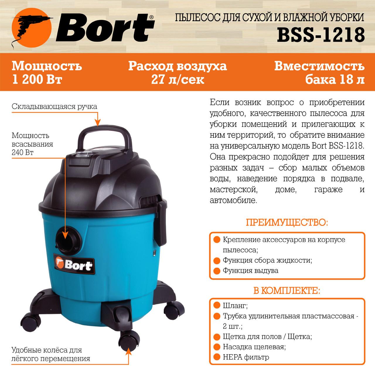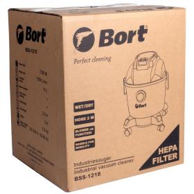 Пылесос Bort BSS-1218 — мощная, универсальная модель подходит для уборки дома, садового, дачного участков, небольших мастерских, гаражей и автомобилей. Конструкция этой модели предусматривает как сухую, так и влажную уборку. Наличие функции выдува позволяет очистить участок от опавших листьев и другого мелкого мусора, а функция сбора жидкости поможет быстро избавиться от разлитой воды. Пылесборник объемом 18 литров изготовлен из качественного пластика и имеет удобные, маневренные роликовые колеса и небольшой вес - 6,3кг. Современный патронный HEPA фильтр защитит турбин от частиц мусора и пыли. Во время влажной уборки этот фильтр играет главную роль - является основным барьером от загрязнений, так как мешок для сбора пыли вынимается, и корпус становится емкостью для сбора жидкости. Для комфортной работы и компактного хранения на корпусе пылесоса есть специальные ниши для аксессуаров.