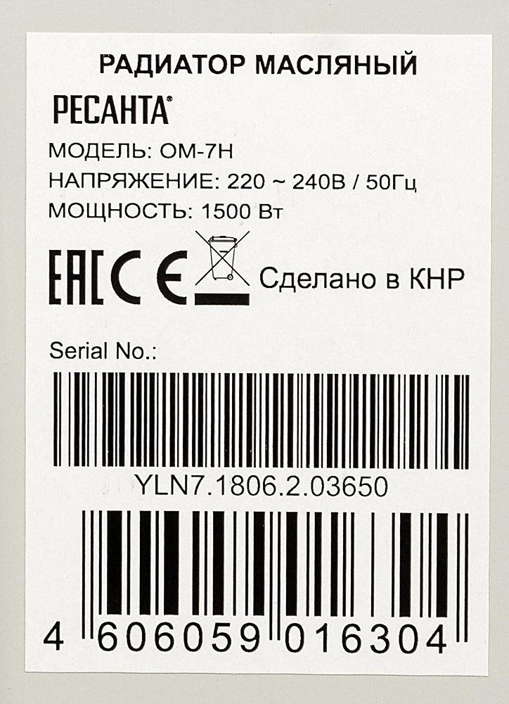 Радиатор масляный Ресанта ОМ-7Н 1500Вт белый / 4dealer.ru