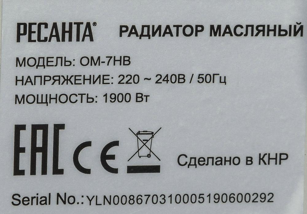 Радиатор масляный Ресанта ОМ-7НВ 1900Вт белый / 4dealer.ru