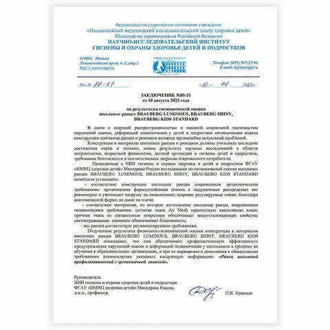 Компактный ранец BRAUBERG KIDS STANDARD выполнен из легкого формоустойчивого материала EVA, благодаря которому содержимое ранца надежно защищено от деформации. Компактный размер, эргономичность, вместительность – главные преимущества данной модели.Ранцы BRAUBERG KIDS STANDARD протестированы НИИ гигиены и охраны здоровья детей и подростков ФГАУ "Национальный медицинский исследовательский центр здоровья детей". В рамках проведенных исследований* было установлено, что конструкции и материалы ученических ранцев соответствуют современным эргономическим требованиям и способствуют формированию здоровой осанки у школьников.