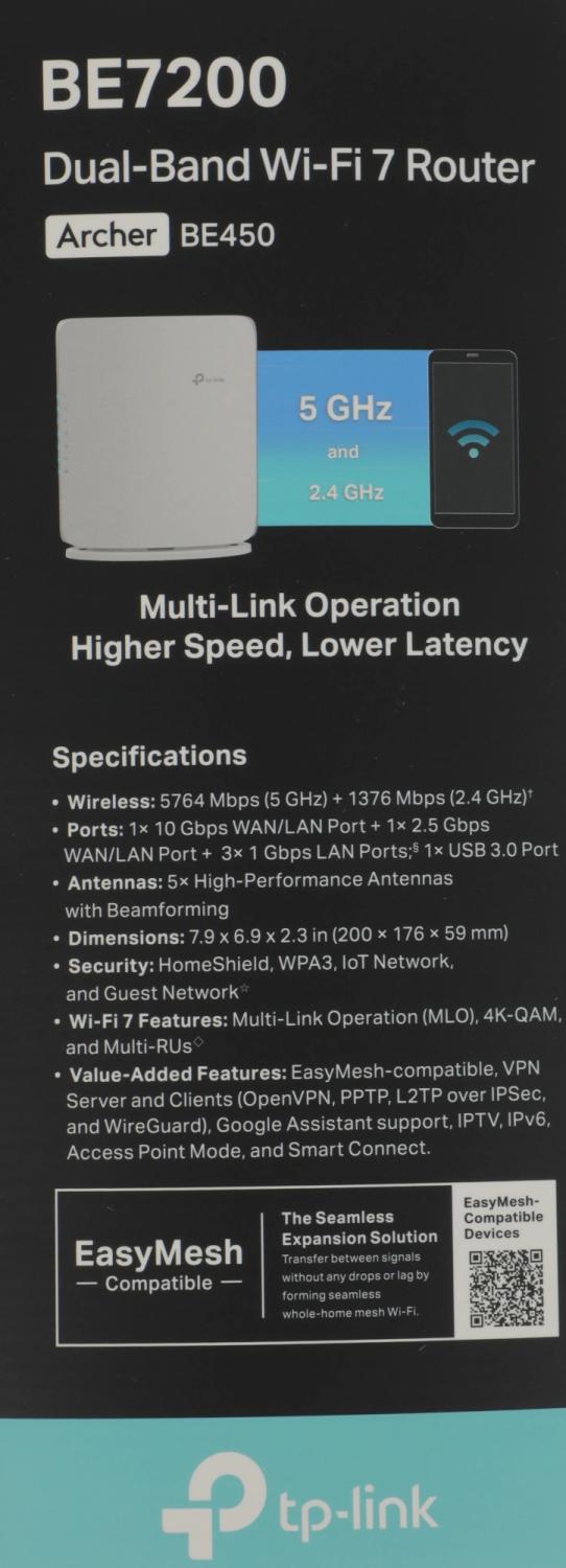 | Комплектация | Маршрутизатор TP-Link Archer BE450, адаптер питания, кабель Ethernet RJ45, руководство по быстрой установке. |