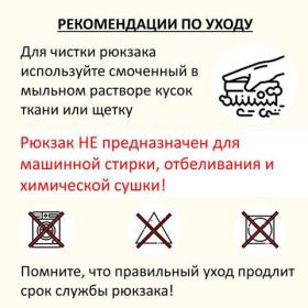 Рекомендации по уходу за изделием: загрязнения легко удаляются с помощью мыла и мягкой влажной губки. Сушить рюкзак следует при комнатной температуре. Изделие не предназначено для машинной стирки, отбеливания и химической сушки.